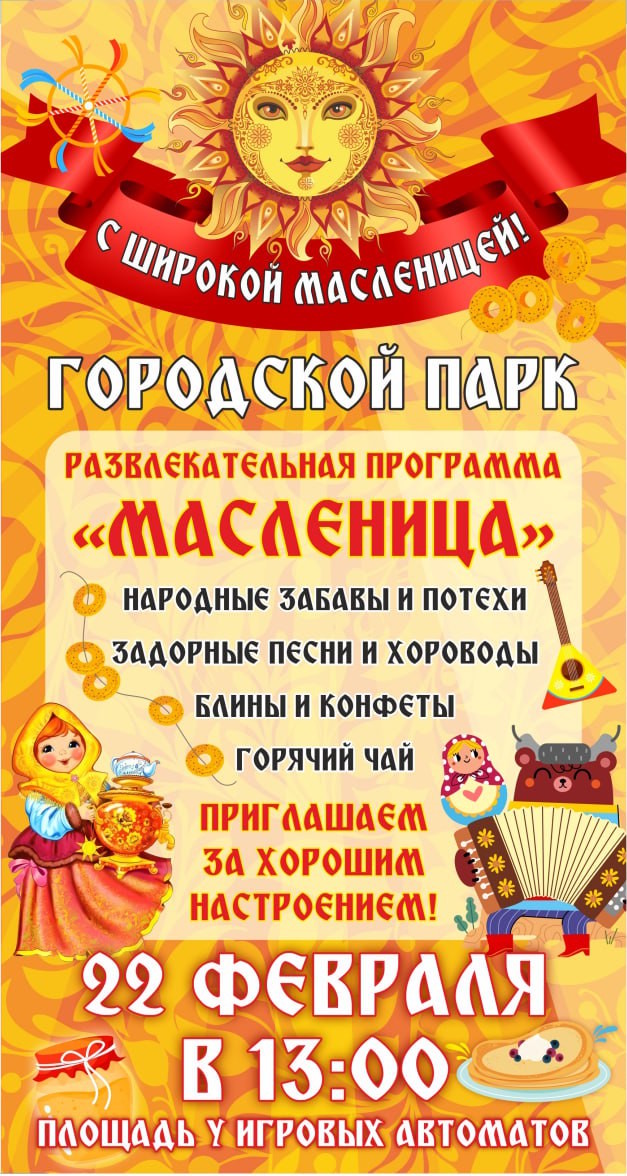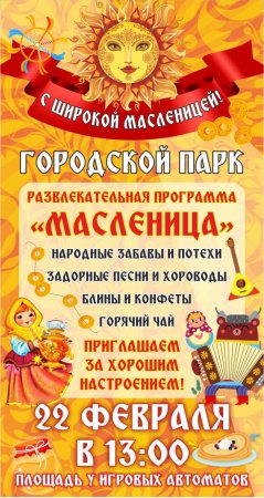 Масленица- старинный русский народный праздник, самый веселый и сытный! По традиции, Масленичная неделя начинается в понедельник и заканчивается в воскресенье. Несмотря на внешнюю простоту — блины, чучело и веселье, каждый день этой недели уникален и наполнен глубоким смыслом. Главный символ праздника - блины, олицетворяющие солнце тепло, плодородие и начало весны. В этом году начало праздника приходится на понедельник 16 февраля, а заканчивается Прощеным воскресеньем 22 февраля. Городской парк приглашает встретить Масленицу веселыми песнями, плясками, вкусными блинами и хорошим настроением! Пусть этот день принесёт вам ощущение праздника, пусть заботы отступят, а на сердце станет тепло и легко. Приходите, очень ждем! 22 февраля в 13.00 на площади у игровых автоматов!